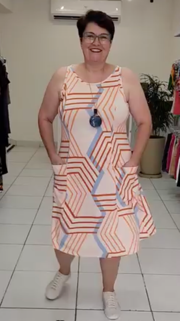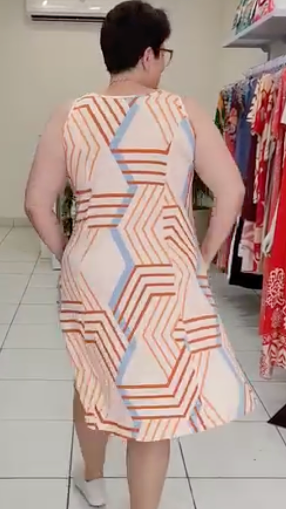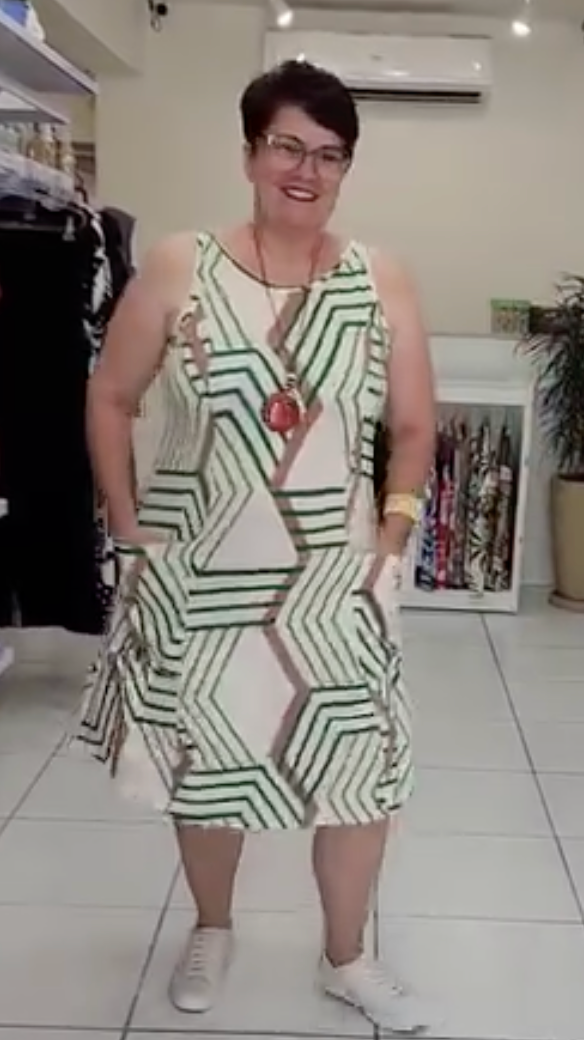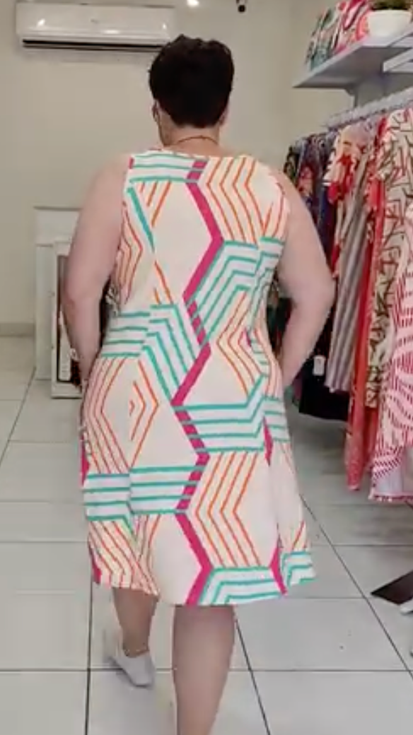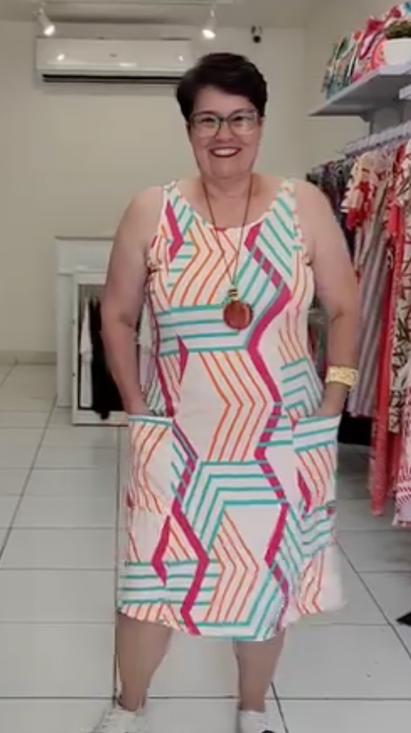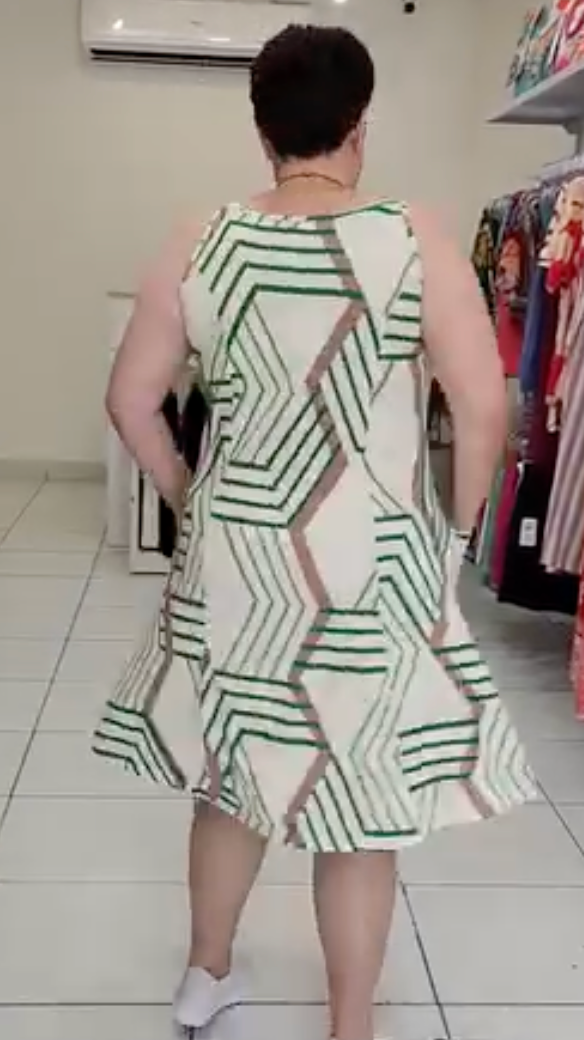 Moderno e cheio de personalidade, o Vestido Renata é a escolha ideal para quem ama um look confortável e estiloso. Sua estampa geométrica em tons de verde e off-white cria um visual arrojado e contemporâneo, perfeito para o dia a dia. Feito em viscose, ele oferece um caimento leve e fresco, ideal para o nosso clima. O modelo regata com alças largas e os bolsos laterais funcionais tornam a peça prática e indispensável no seu guarda-roupa.